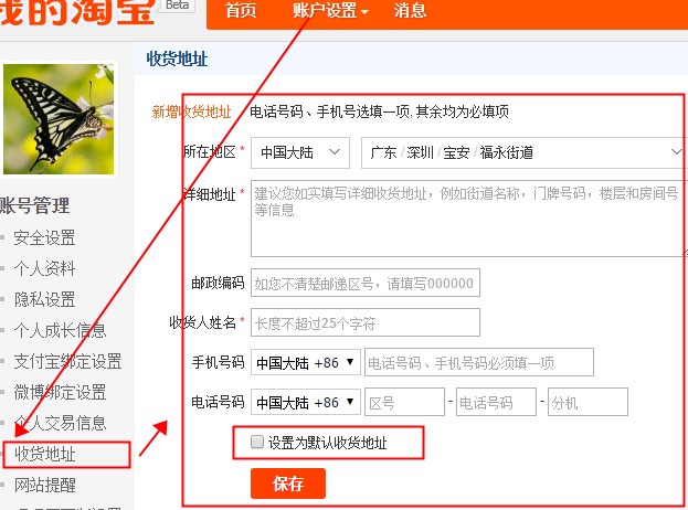 3、為了提高熱門產品搶購成功率,您也可以使用自己的淘寶會員賬號進行搶購。搶購成功后使用 代付的方式,由我們這邊幫您付款。若需要使用這種方式,需要提前聯絡客服說明,客服會給您提供相應的收貨地址。您需要提前把地址填寫到您的會員賬號中,并設置為默認收貨地址。設置方式如下圖: